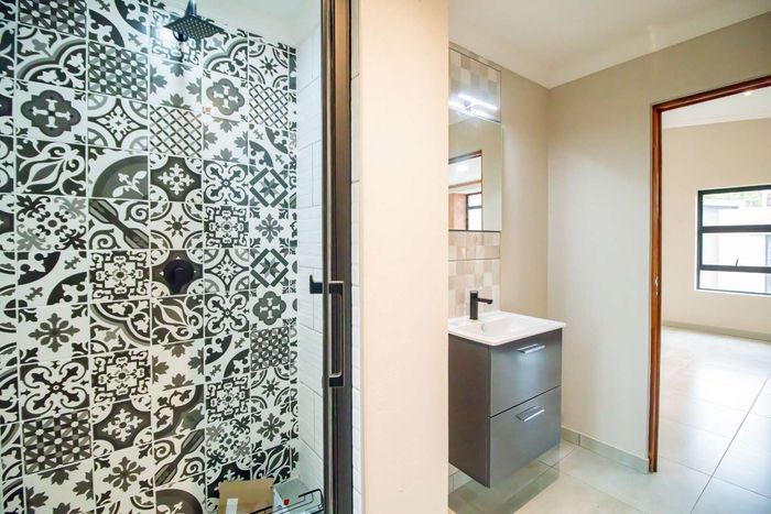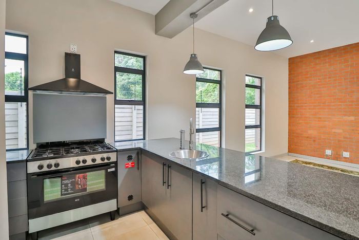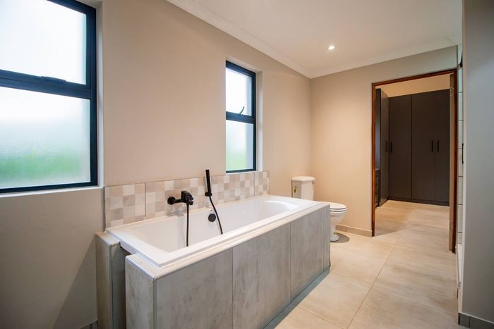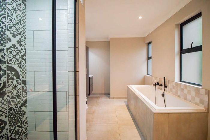 Live in light-filled contemporary family comfort in a peaceful neighbourhood, with open-plan kitchen and patio braai, three en-suite bedrooms, double garage and solar rainwater harvesting.