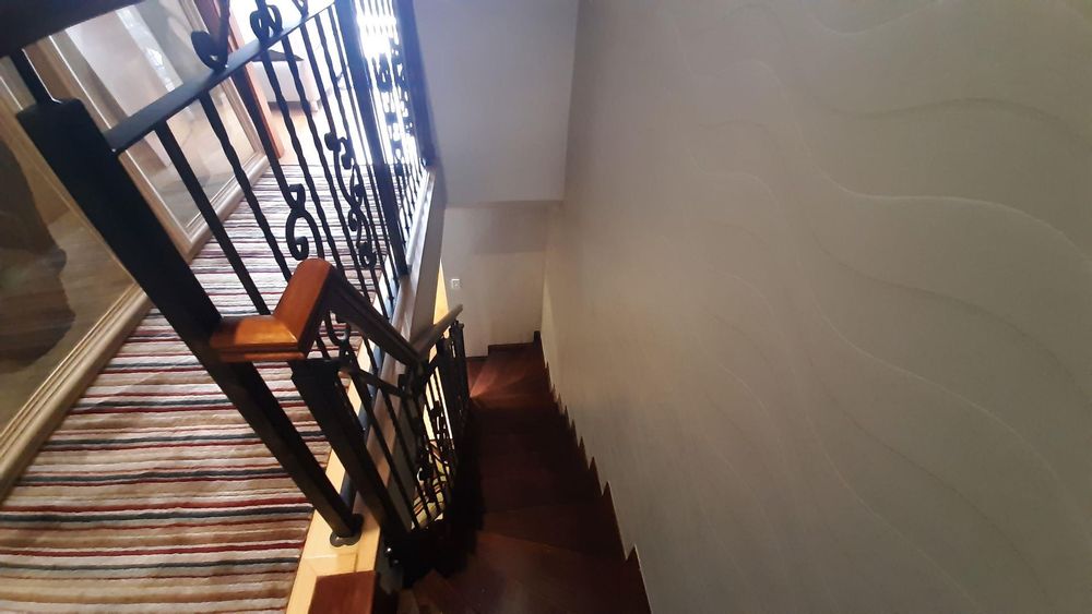 The wooden staircase leads up to two large bedrooms each with built in cupboards and both with en-suite bathrooms consisting of a basin, toilet and shower.