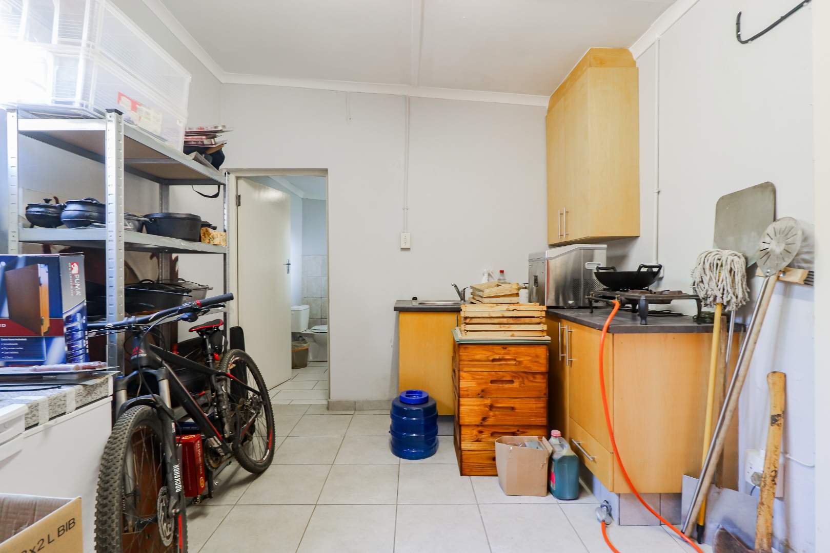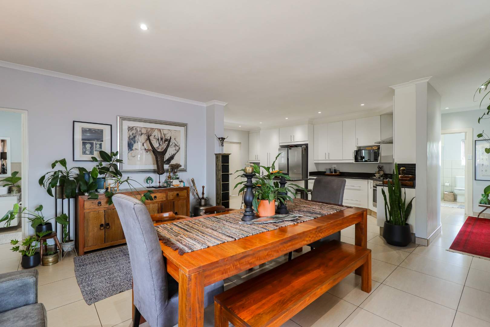 The kitchen leads into the dining area and comfortable lounge with a guest toilet for convenience.